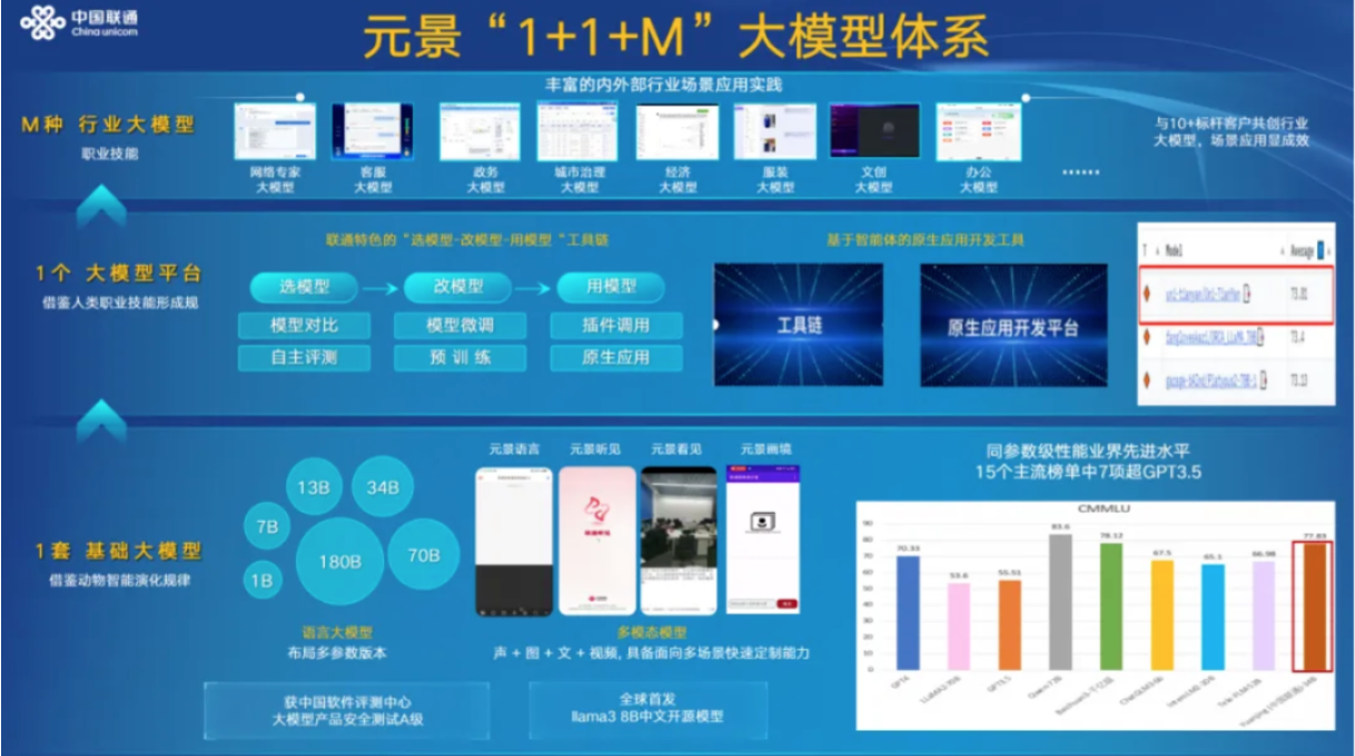 中國聯(lián)通元景大模型已通過中央網(wǎng)信辦生成式人工智能服務(wù)備案,并獲得中國軟件評測中心大模型產(chǎn)品安全測試A級。此外,積極探索對主流開源模型的中文能力提升和安全合規(guī)性改造,研發(fā)并開源了全球首個Llama3 8B中文版模型。這一系列成果充分展現(xiàn)了中國聯(lián)通在人工智能尤其是大模型領(lǐng)域積極布局取得的成績。