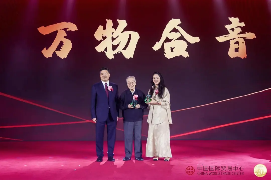 回望奮斗路,國貿(mào)中心的輝煌成就離不開富有遠見的奠基人和創(chuàng)業(yè)者。其中101歲高壽的馬來西亞華人郭鶴年先生是國貿(mào)中心的奠基者之一,他雖然身在香港,但是心卻在國貿(mào),他以最傳統(tǒng)的信函方式表達了對國貿(mào)中心的深厚感情。魏玉明先生是國貿(mào)中心第二任董事長,2024年正是魏老百歲華誕,他親臨大會,并寄語國貿(mào):繼承艱苦奮斗的精神,開創(chuàng)宏偉事業(yè)的未來。大會現(xiàn)場,盛秋平董事長代表國貿(mào)中心向郭鶴年先生和魏玉明先生兩位德高望重的百歲老人致敬獻禮。禮物是名為“萬物合音”的琉璃作品,既代表兩位老人的高雅品格,又象征著合資雙方精誠合作成就了 “銳意進取,鑄就非凡”的國貿(mào)精神;葫蘆的造型設(shè)計更是對兩位老人福祿雙全、健康長壽的誠摯祝福。