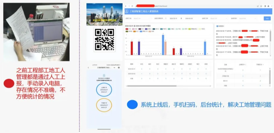 施工人員手機(jī)掃描二維碼即可進(jìn)行上下班打卡,方便快捷。