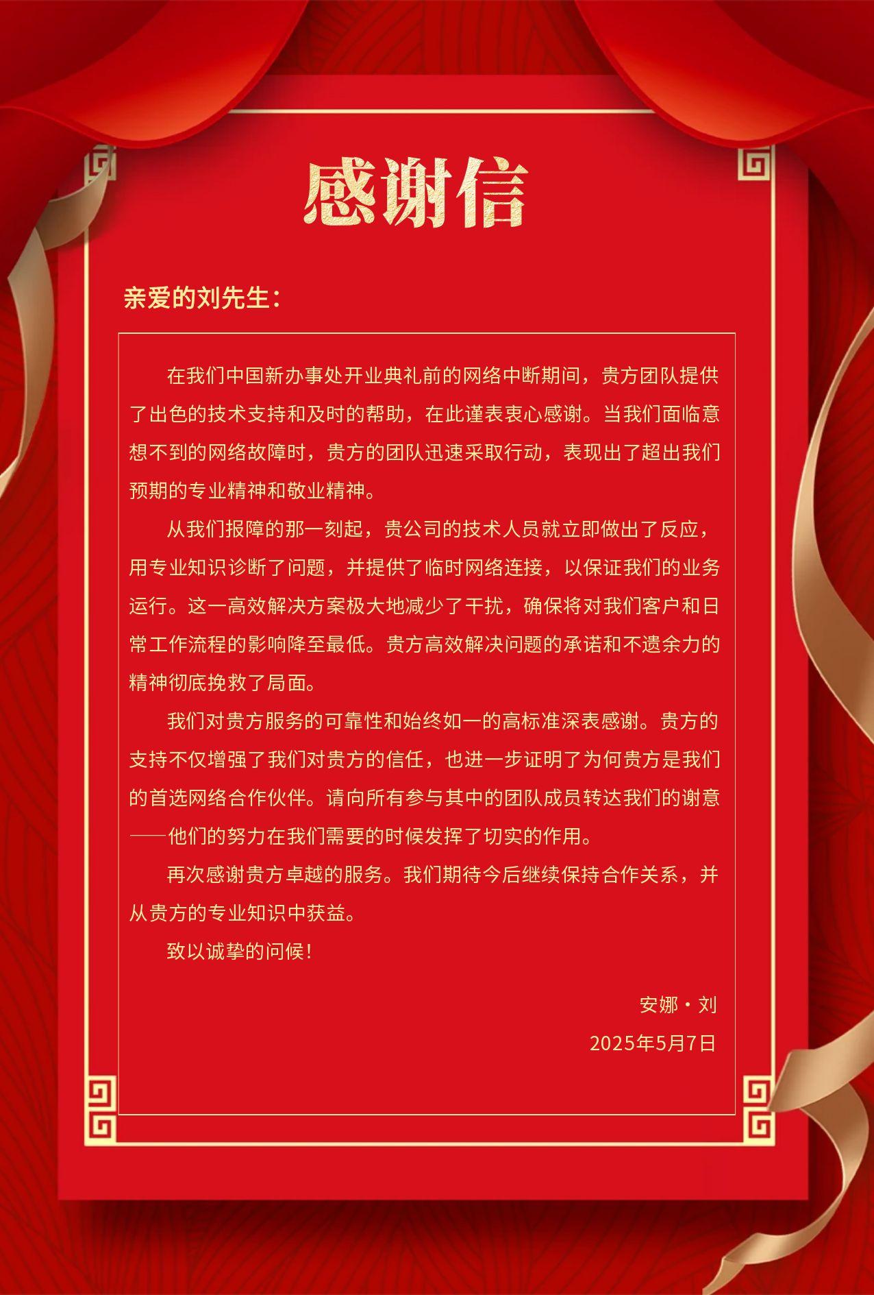 時代網(wǎng)星踐行國貿(mào)領(lǐng)導(dǎo)多次強(qiáng)調(diào)的 “以客戶需求為核心” 理念,將客戶的需求與體驗置于首位。在實際服務(wù)中,將這份理念化作切實行動。今年是時代網(wǎng)星成立 25 周年,在5月7日網(wǎng)星收到一封來自新入駐國貿(mào)的全球知名客戶的感謝信。