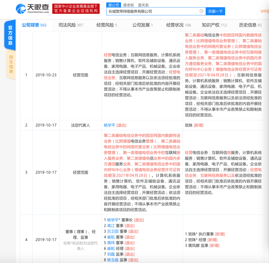天眼查數(shù)據(jù)顯示,10月17日,長(zhǎng)城寬帶運(yùn)營(yíng)主體長(zhǎng)城寬帶網(wǎng)絡(luò)服務(wù)有限公司出現(xiàn)多項(xiàng)變更,楊學(xué)平卸任法定代表人和董事長(zhǎng)一職,班殊接任法定代表人、經(jīng)理、執(zhí)行董事。與此同時(shí),原董事、監(jiān)事全部退出,新增監(jiān)事黃鳳娜。
